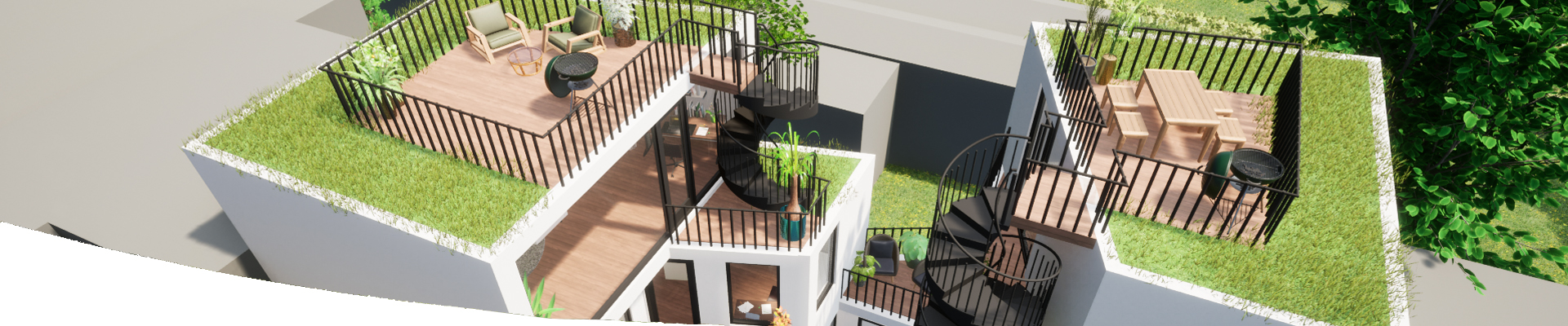 Bij dit ontwerp was de voorkant al vastgelegd, omdat het moest aansluiten op de reeds bestaande dakopbouw. Echter de achterkant hebben we ontworpen zoals we zelf wilden. De combinatie van houten pergola, kozijn en vloer met de witte gevel en hekwerk geeft een zomerse uitstraling. Dit gecombineerd met planten in de voorontworpen plantenbakken maakt het geheel af. Bekijk hier het gehele project.