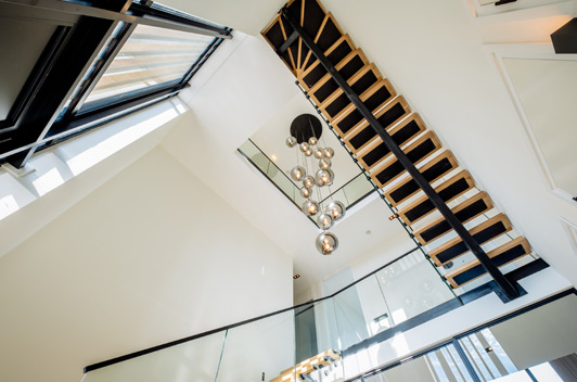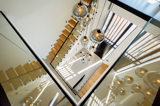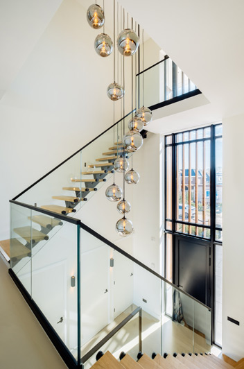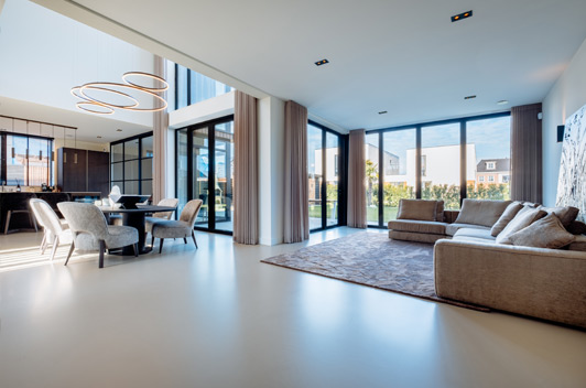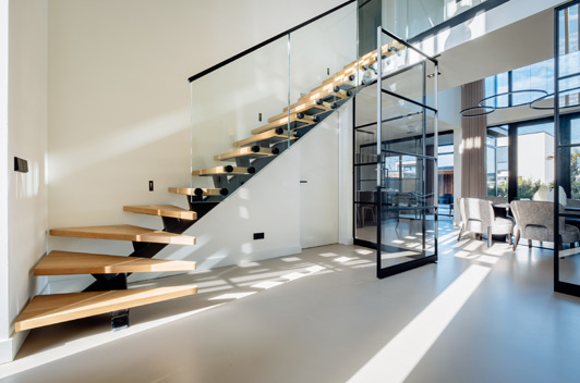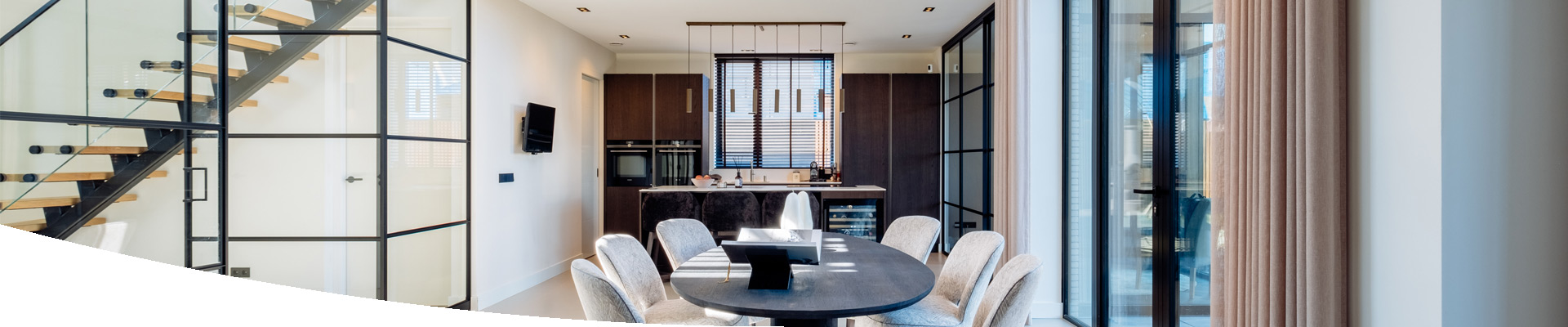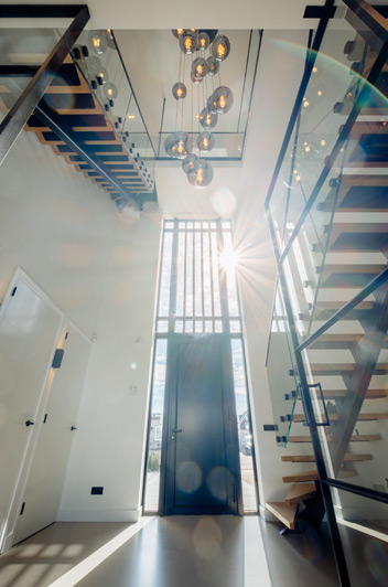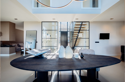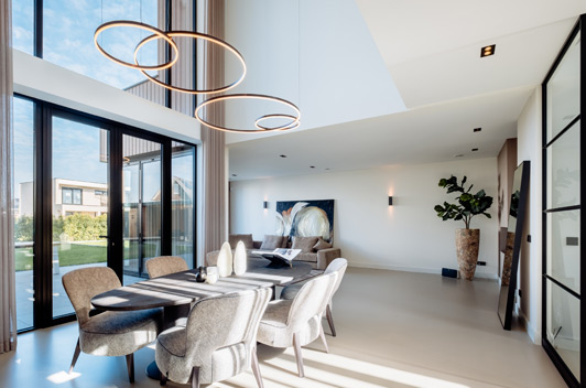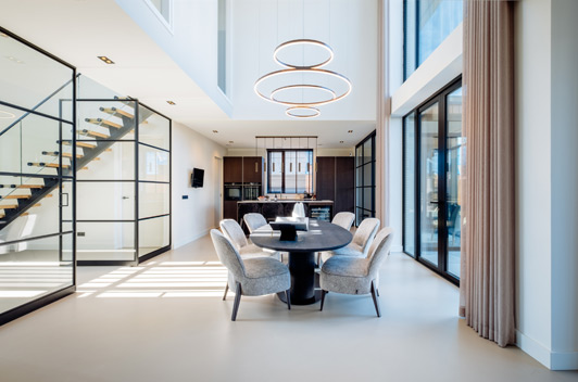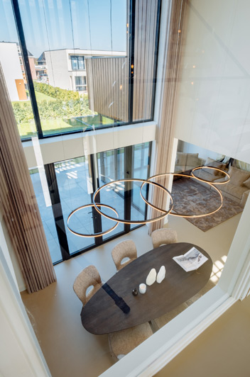 Meteen zichtbaar vanuit de centrale hal is het eetgedeelte. Door de twee lagen hoge ruimte is dit met recht het centrum van de villa. Ook de centrale hal is een eyecatcher van het huis. Het adembenemende trappenhuis heeft zwevende trappen en glazen hekwerken. De twee-laagse vide zorgt voor een ‘wow’ effect bij binnenkomst.