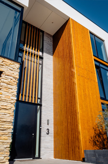 De lamellen zorgen voor privacy bij de entree, zonder dat het het licht uit de ruimte weghaalt.