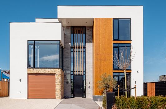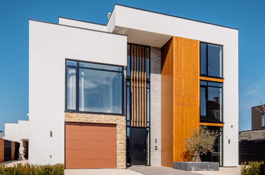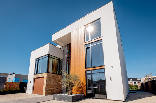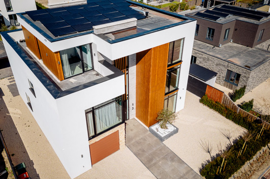 Het ontwerp van de woning is voor en achter georiënteerd. De zijkanten zijn zoveel mogelijk gesloten voor zoveel mogelijk privacy.