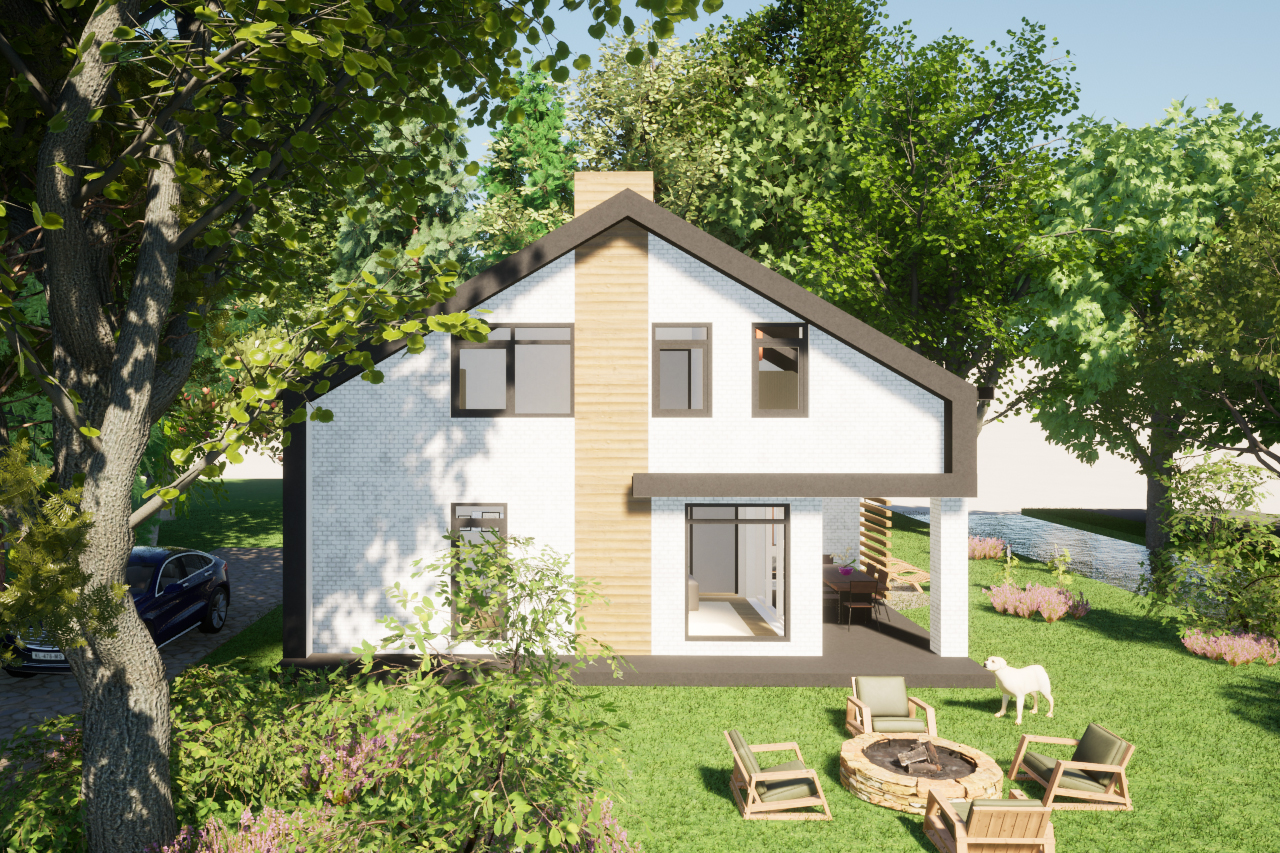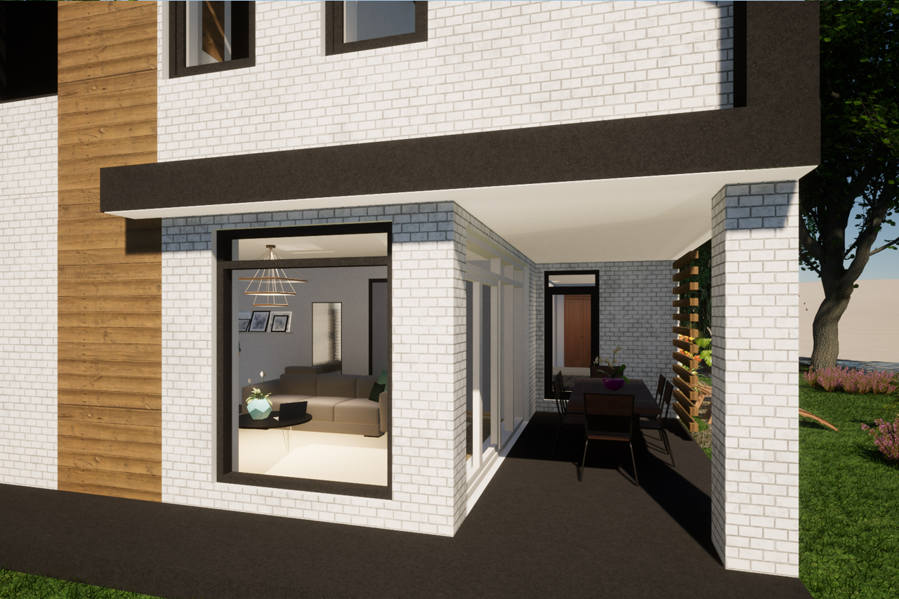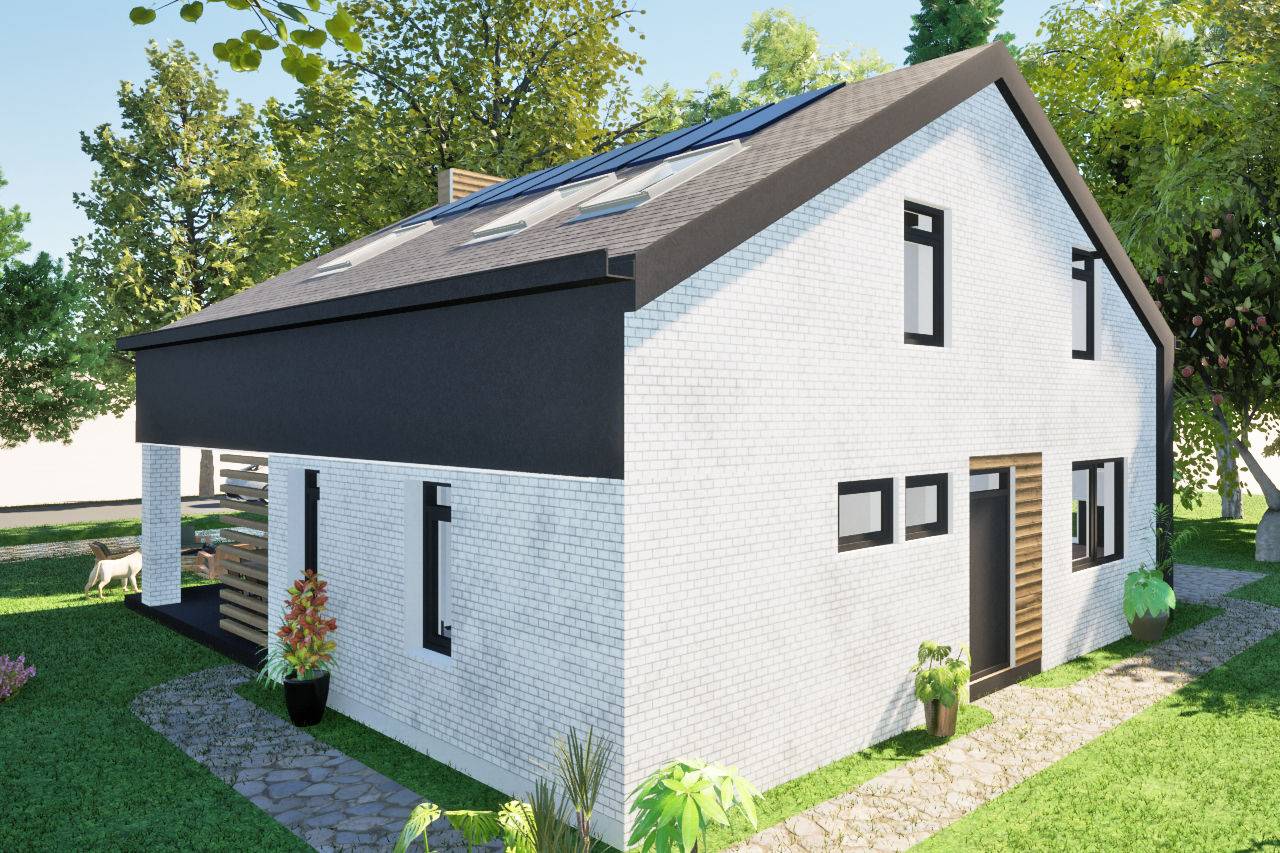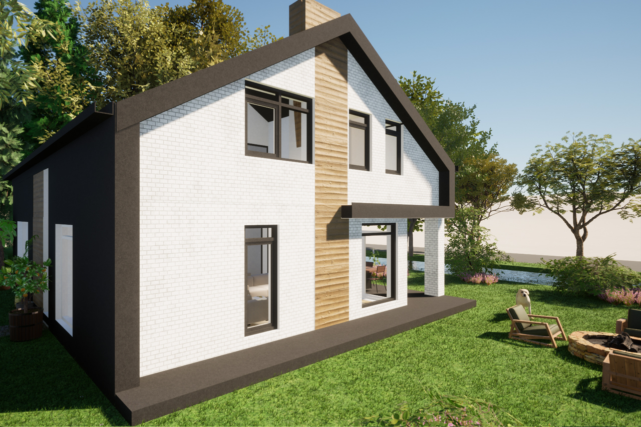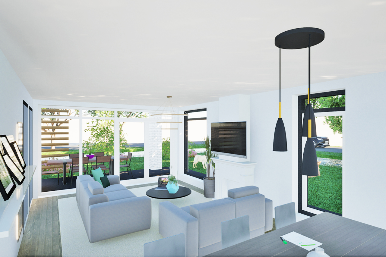 De villa is gekenmerkt door zijn indrukwekkende hoge ruimtes die een gevoel van vrijheid en luchtigheid uitstralen. Grote raampartijen zorgen voor een overvloed aan natuurlijk licht, wat de woning een warme en uitnodigende sfeer verleent. Het spelen met verschillende materialen is een centraal element van het ontwerp; de combinatie van hout en witte bakstenen geeft de villa een eigentijdse uitstraling, terwijl de grijze lijnen die de woning omlijsten een elegant kader vormen.